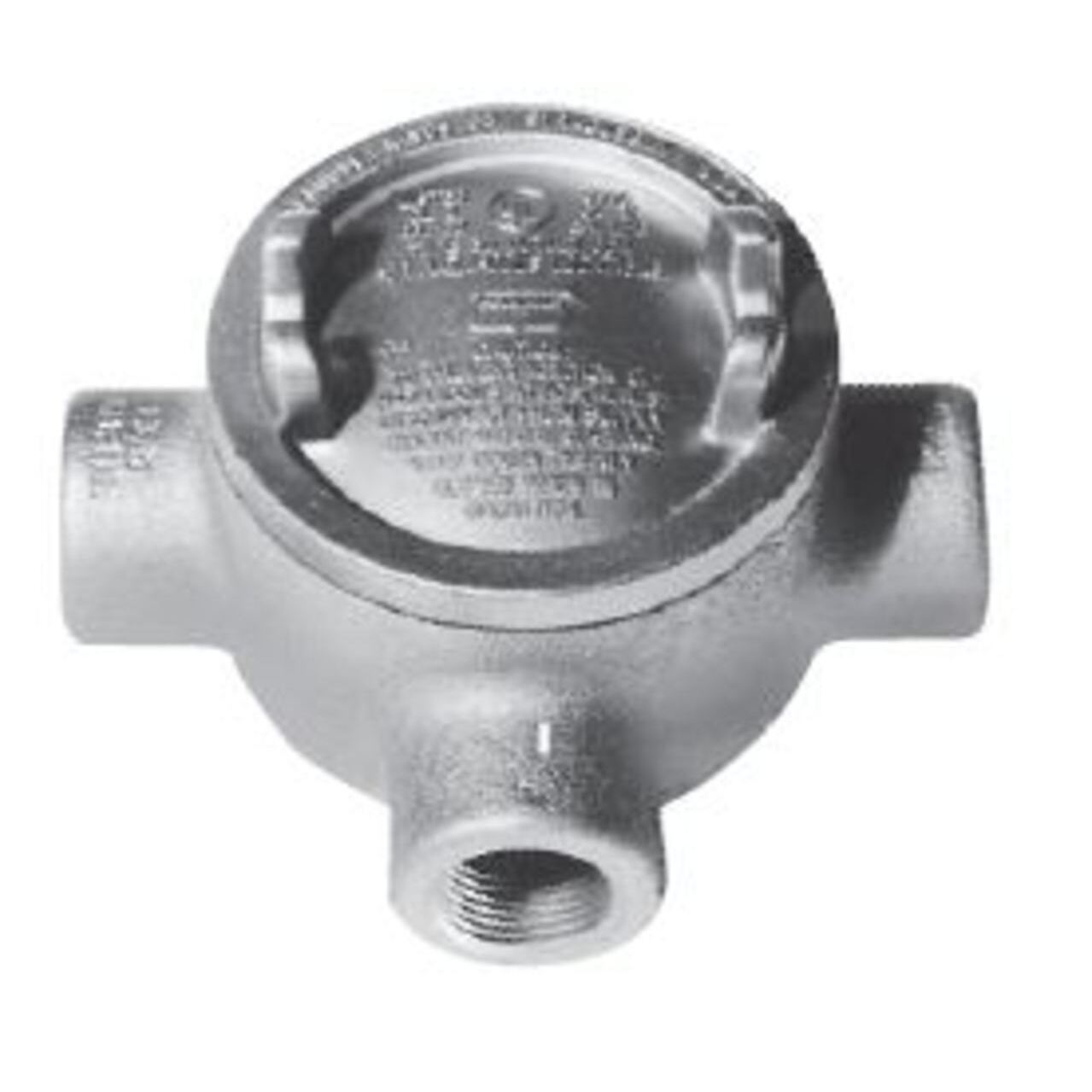 Eaton Crouse-Hinds series Condulet GUA conduit outlet box with cover, 3" cover opening diameter, Feraloy iron alloy, T shape, 1/2"
