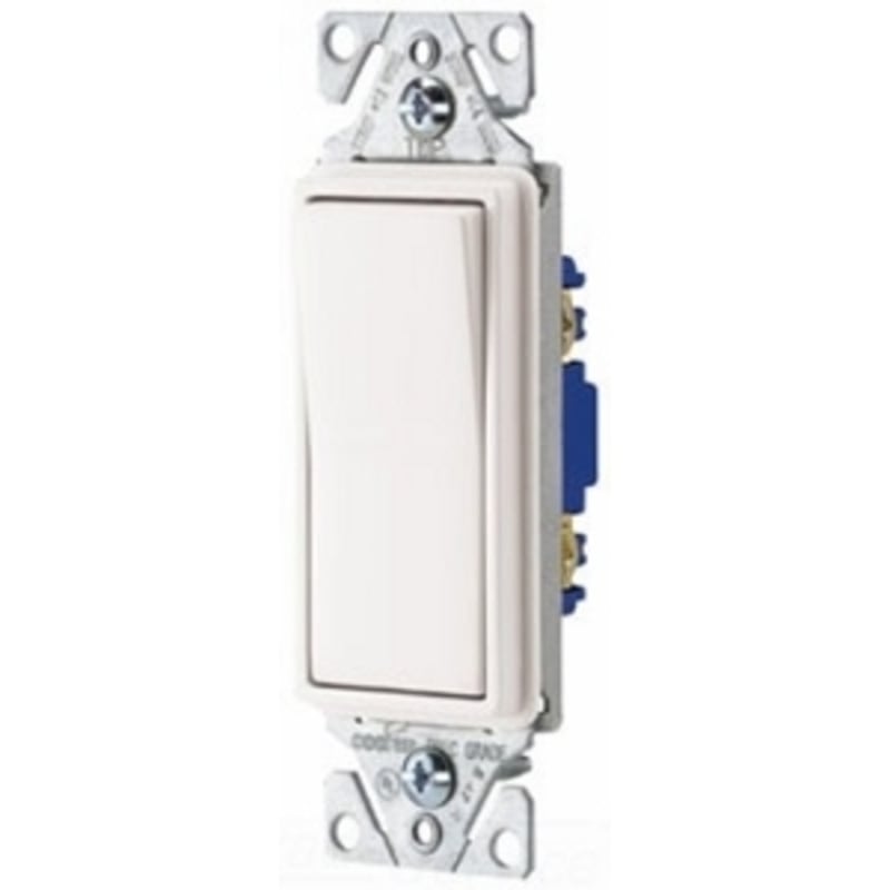 Eaton standard grade decorator switch, #14-12 AWG, 15A, Flush, 120/277V, Back/push, Decorator, Maintained, White, Motor Control, Fan, LED, Incand, ELV,MLV,CFL, Florscnt, Halogen, Single-pole, Thermoplastic 627590