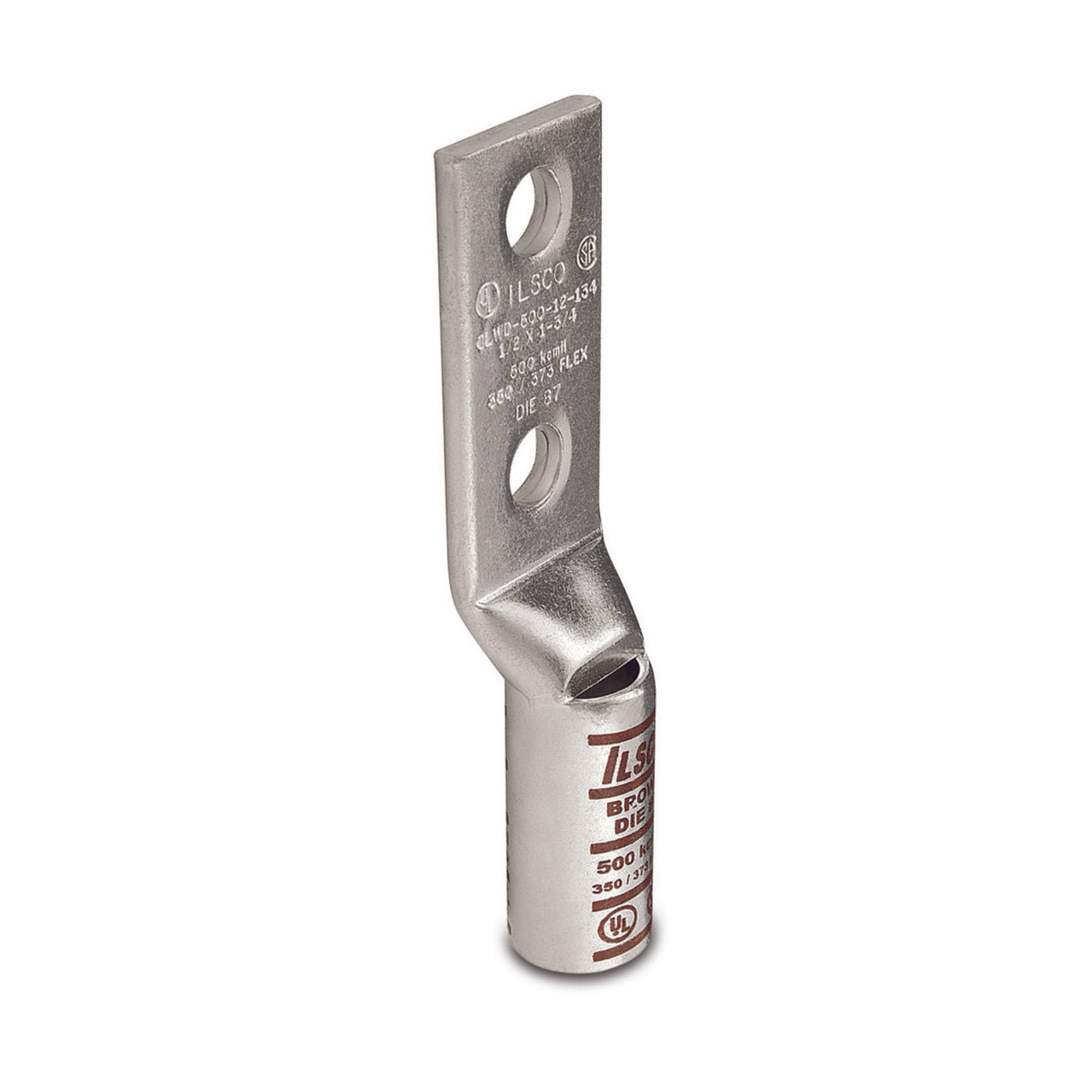 Aluminum Compression Lug, Wire Size: 1000 MCM, Long Barrel, 2-Hole Stud, Stud Diameter: 1/2". Wire Diameter: 1.153". Dual Rated for Aluminum or Copper Conductors.